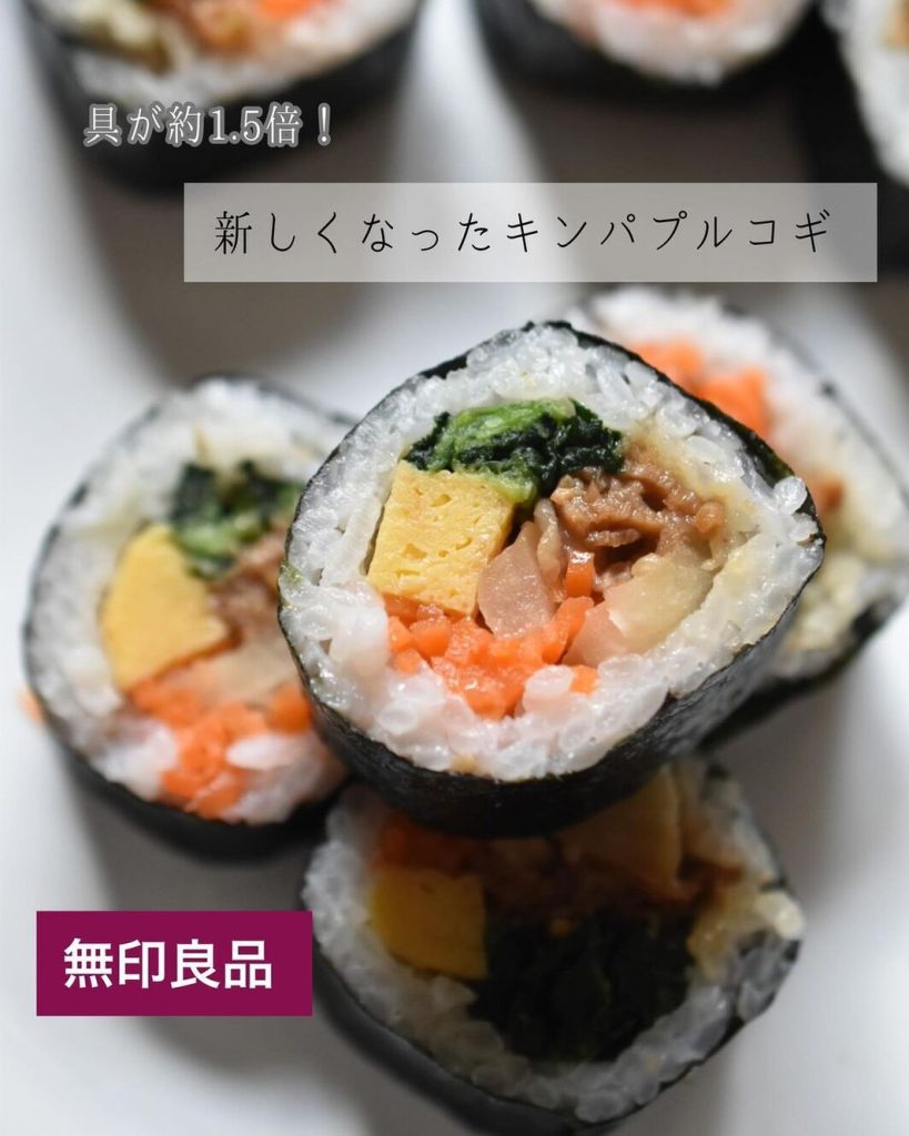 甘辛く味つけした牛肉に、ほうれん草や玉子などを加えた5種の具材を巻いた海苔巻き。リニューアルして、具材が1.5倍となり食べ応えがアップしています。カットされているので、手軽に食べられますよ。
