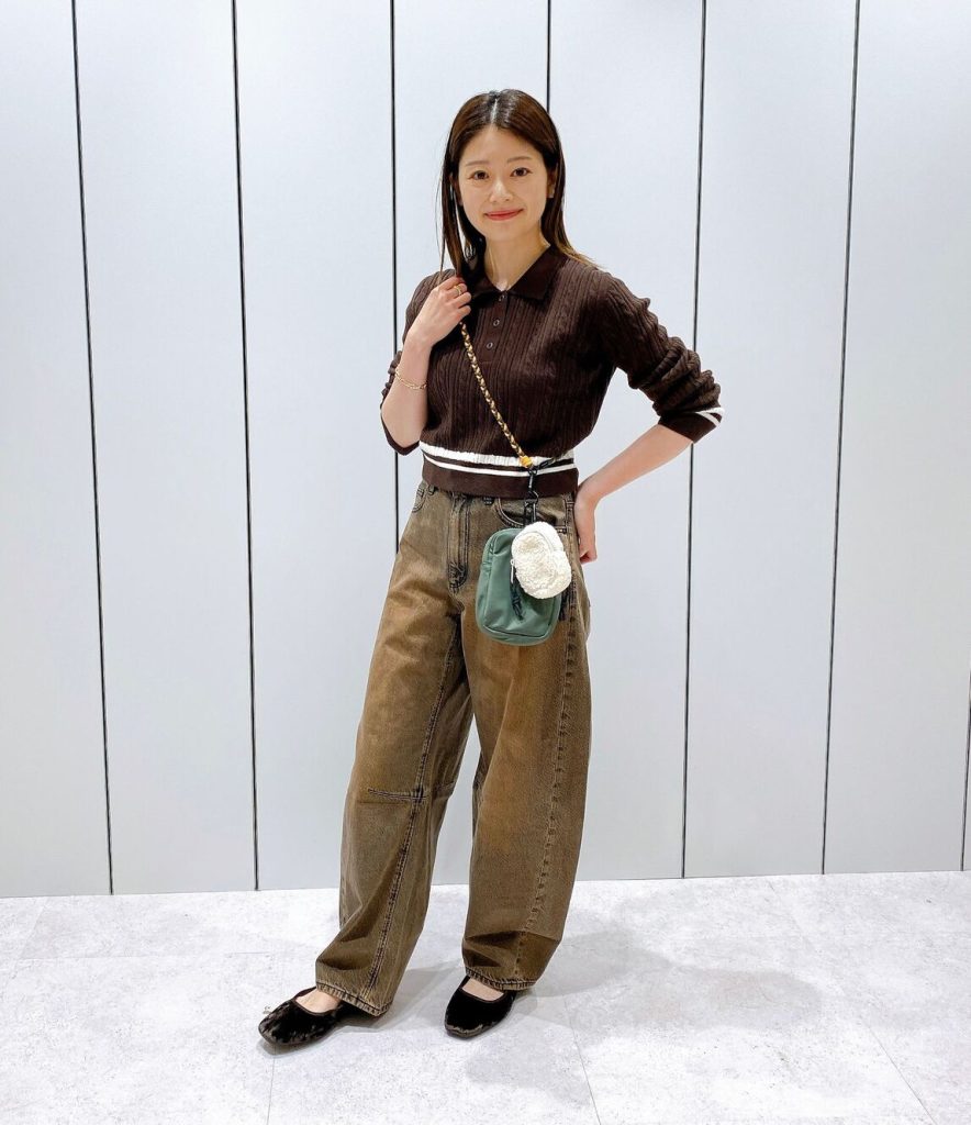 ブラウンのニットをチョイスすれば、トレンド感がさらに上がります。メリージェーンシューズのテイストはバレエコアですが、カジュアルなアイテムと合わせることもできるため汎用性も高いですね。