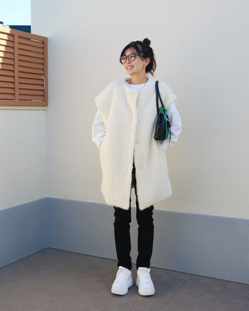 きれいめな雰囲気が強いファーベストですが、デニムとのカジュアルコーデともバランスよく着こなせます。
