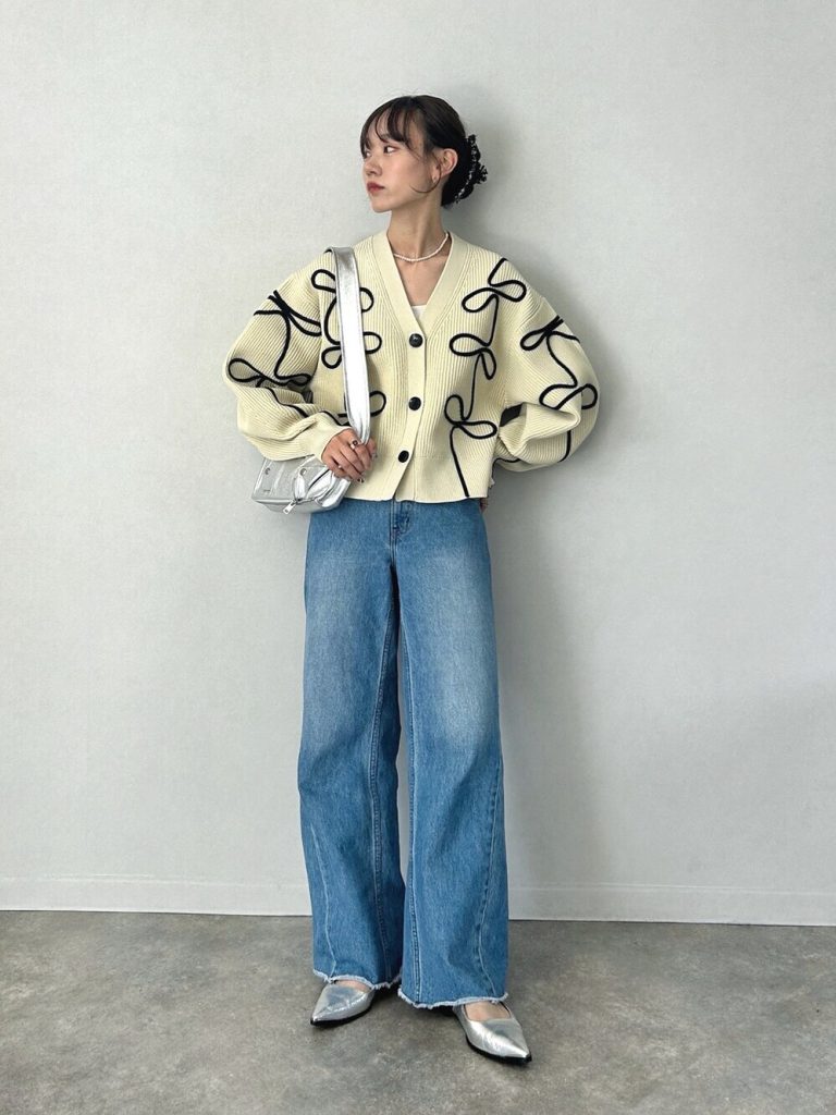 刺繍で描かれた曲線的なラインと、丸みのある立体的なフォルムがかわいいニットカーディガン。スッキリと着られる短めの丈感が今っぽいです。ブルーのワイドジーンズと合わせてきれいめカジュアルの完成。
