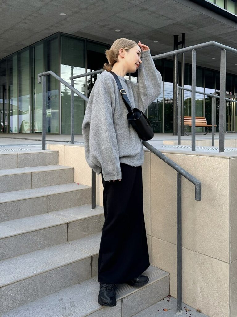 裾リブでスッキリと見える黒タイトスカートには、ゆったりとしたグレーのニットを合わせれば、リラクシーなモノトーンコーデの完成。バッグやスニーカーなど小物まで黒でそろえて統一感もアップです。