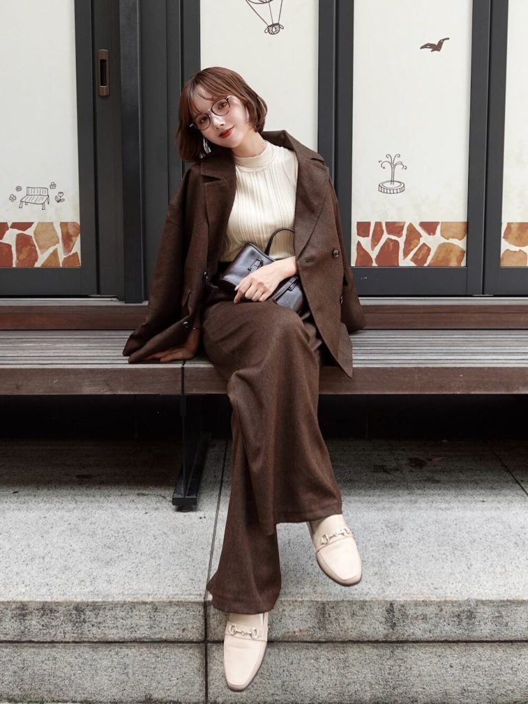 2024秋冬は濃いめの「チョコレートブラウン」がトレンドカラー。ブラックよりやわらかなイメージになり、エレガントな冬スタイルにぴったりなのがポイントです。