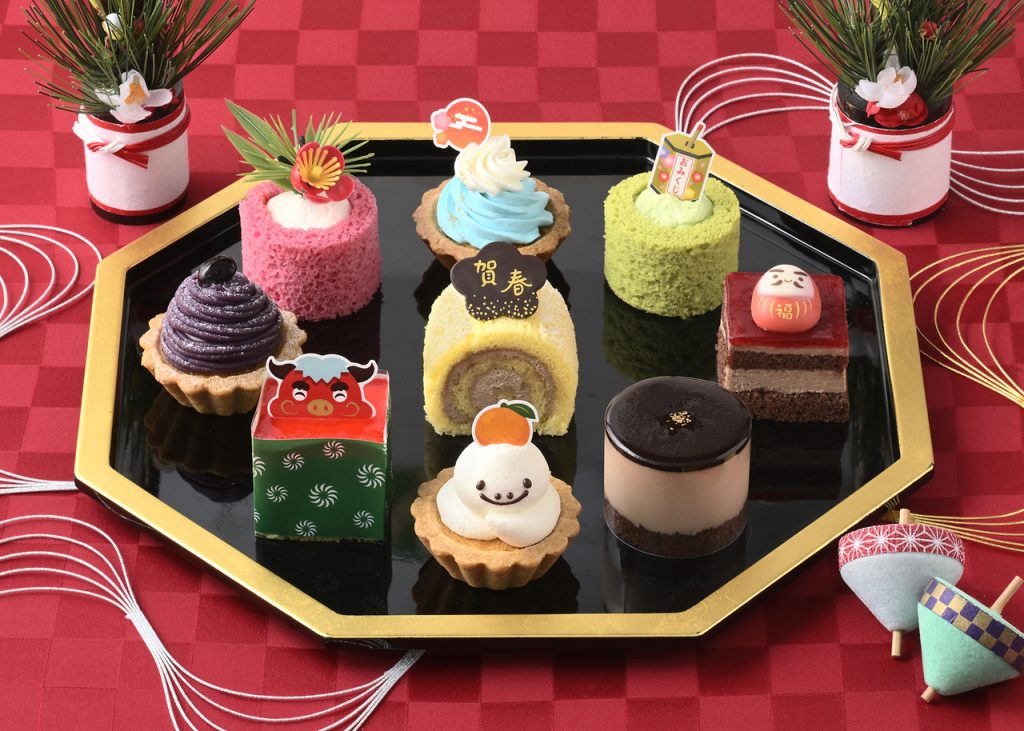 2025年の干支のへびや初日の出をモチーフにしたタルト、だるまを飾ったケーキなど、9種のプチケーキがおせちのように詰まったボックスです。おせち料理の後のデザートとして出せば、歓声が上がること間違いなし!