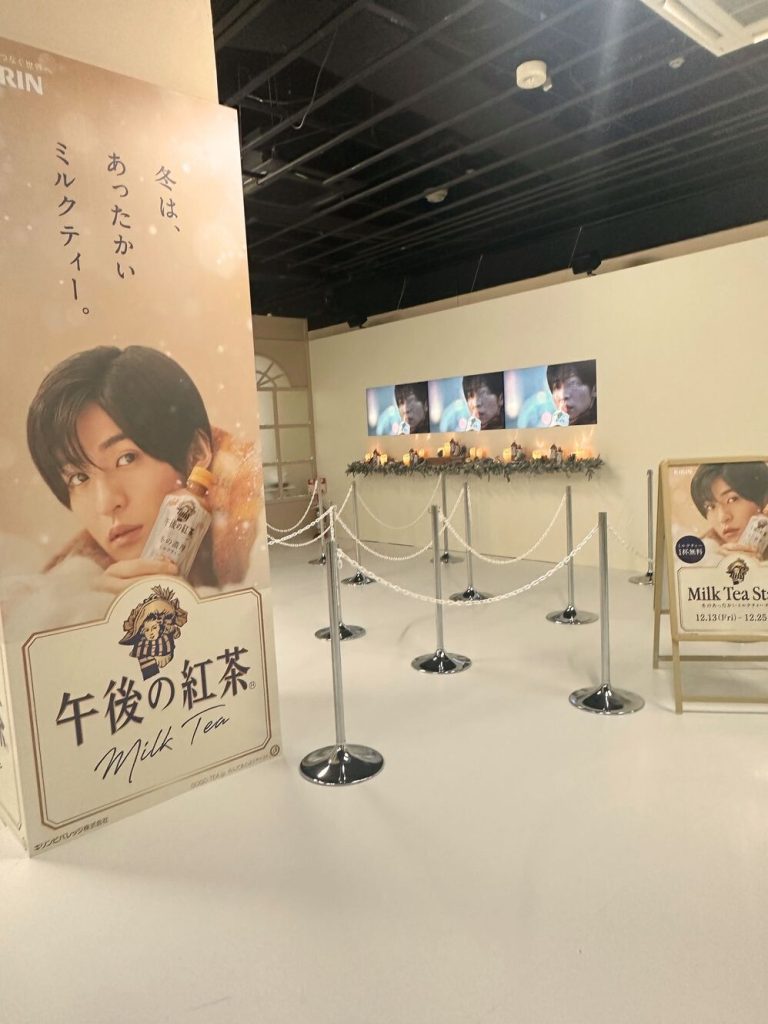 会場の扉が開くと、まず目黒蓮さんの特大ポスターがお出迎え。「雪だるまの夢」篇のCMの映像も流れていて、見渡す限り”目黒蓮さん”の夢の空間に包まれ、幸せな気持ちが体験できます。