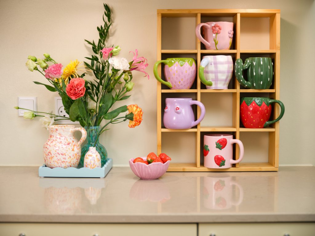 左側のマグは、バレンタインをイメージするような真っ赤なリボンがハンドル部分に。右側は持ち手の部分がお花のデザインになっていて、春の気分を運んでくれます。
