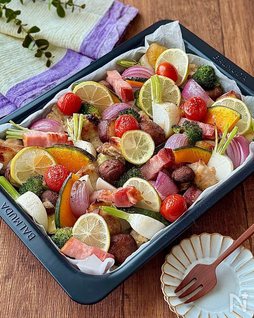 鶏もも肉とベーコン、旬の冬野菜がたっぷり楽しめるオーブン料理。鶏肉は塩麹に漬け込んでサッと焼き、火の通りにくい根菜はレンチンしておきます。オーブン皿に全ての具材を詰めて香ばしく焼き上げれば完成です。