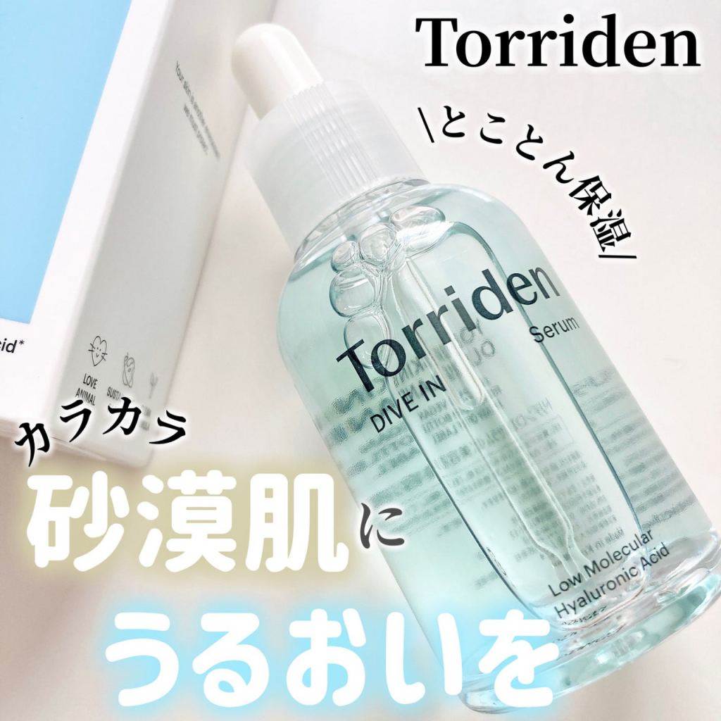 「Torriden(トリデン)」は、ヴィーガン処方で肌と環境のことを考えた、韓国のスキンケアブランドです。特にトリデンで人気の美容液が、「3秒セラム」や「水分セラム」という代名詞もある、「ダイブインセラム(dive-in セラム)」。