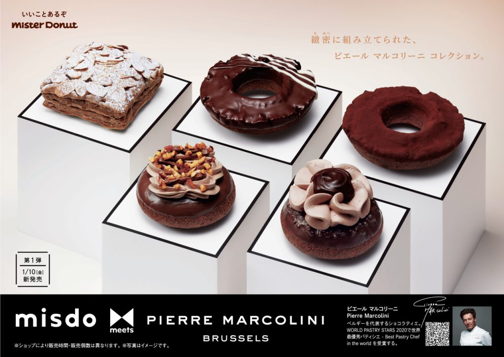 1月10日(金)第一弾が新発売!ミスタードーナツとベルギー王室御用達のショコラティエ「PIERRE MARCOLINI」が共同開発した、『misdo meets PIERRE MARCOLINI』が期間限定で登場します。