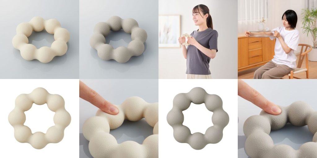 可愛いフォルムで手に取りやすい、まるでドーナツみたいなトレーニングチューブです。ソフトな"ふわふわ"タイプと、ちょっと硬めの"もちもち"タイプがあり、保管に便利なファスナー袋も付いてきます。