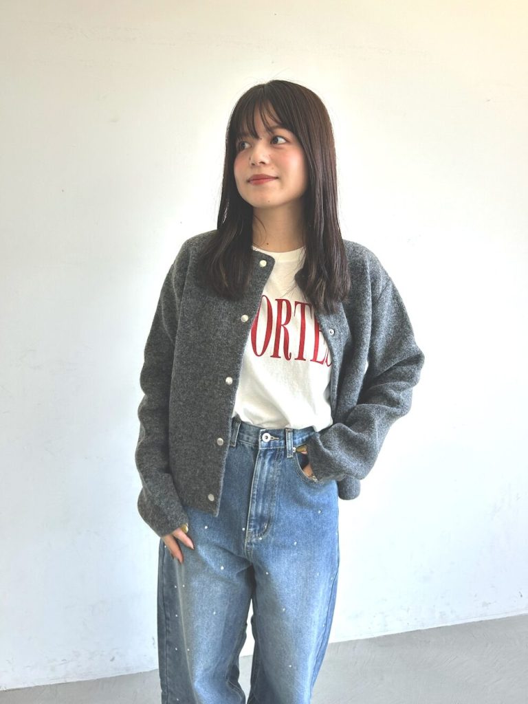 このニットは、ふわふわなだけではなくもちっとしたテクスチャーが特徴的。クロップド丈なのでバランスよく着られて、シルエットにメリハリをつけることができます。胸元のロゴはシンプルなので、大人っぽく映るところもgood。友達とかぶりにくいロゴニットを探している方におすすめです。