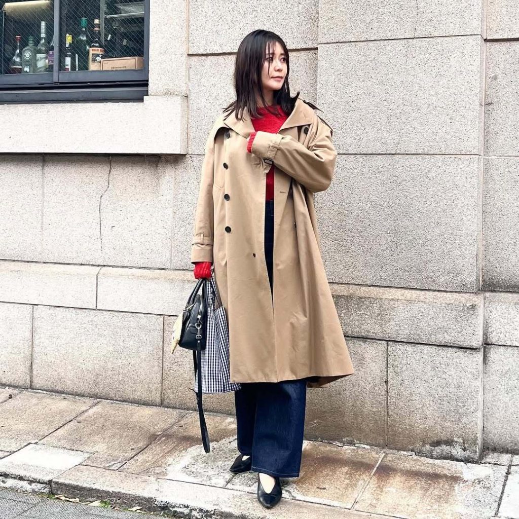 まだまだ気になる赤アイテム。これからコーディネートを組むなら、トレンチコートを羽織ってパリジェンヌ風に着こなすのが正解です。大人っぽく、でもトレンド感はしっかりキープ。ネイビーのデニムを穿いてフレンチシックにまとめれば、まさにオシャレ上級者さんの着こなしに。