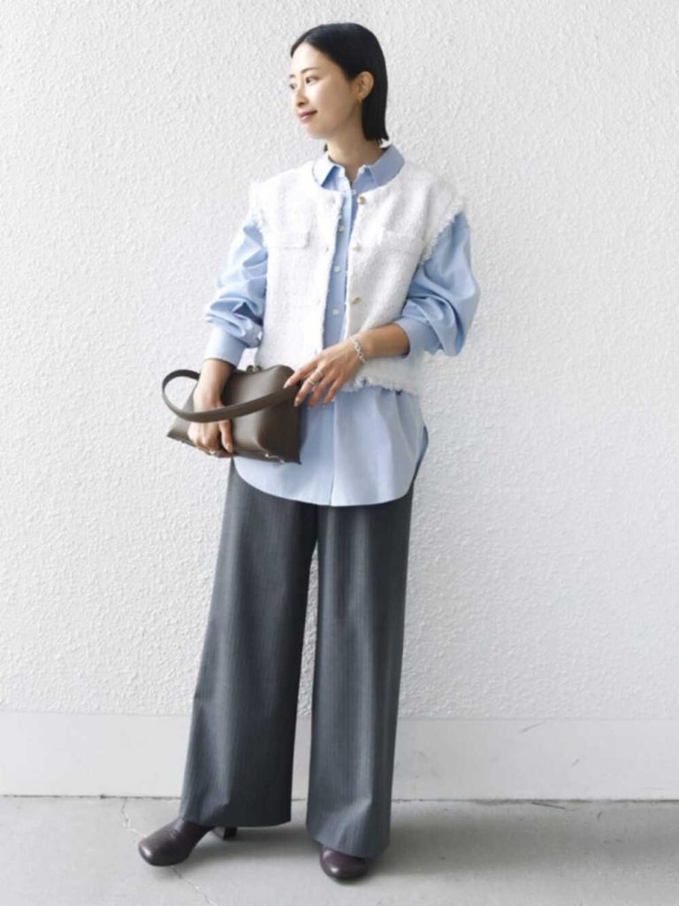 ツイード柄をニットで表現したこのベストは、トレンドのフリンジもあしらわれていて上品な雰囲気。やや着丈が短めなので、春らしいブルーのシャツに重ねればレイヤードが引き立ちます。ベストとパンツの色味を合わせればセットアップ風コーデになり、オケージョンにも着回せそうですね。