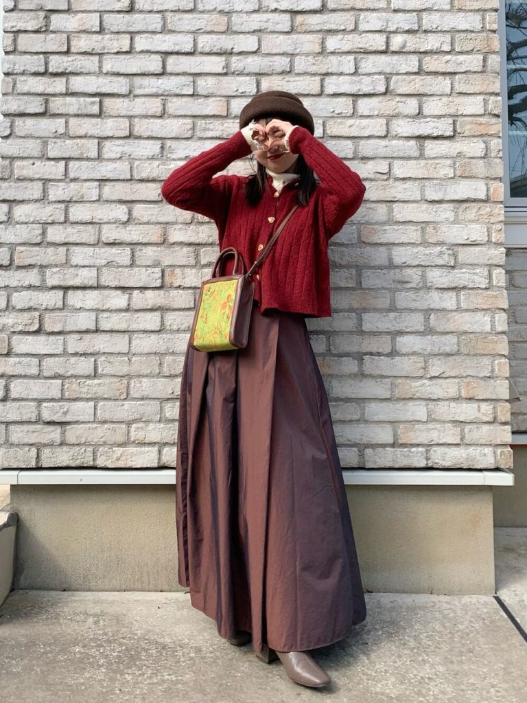 ブラウンのマキシスカートに、グリーンの花柄がかわいいバッグを合わせて、ピスタチオチョコレートをイメージしたコーデに仕上げています。バレンタインだからこそ楽しめる着こなしですね。