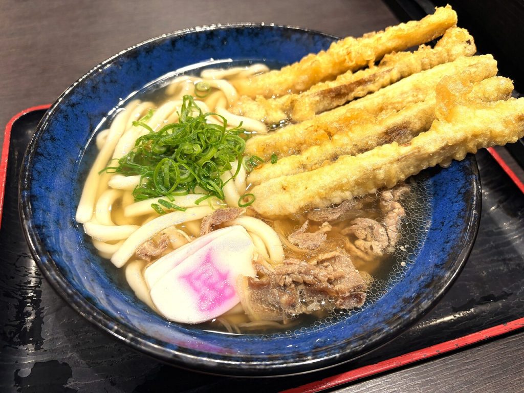 うどんは思っていたよりもやわらかめです。丸亀製麺のようなコシのあるうどんを食べ慣れている筆者はちょっとびっくり。とはいえ、つるんとなめらかな口当たりがクセになり、どんどんお箸が進みます♡だしは甘みがあるものの、決して味付けが濃いわけではないので、ごぼう天や甘辛い牛肉とのバランスが良い印象。うどんが太いので食べ応えがあり、大満足でした!