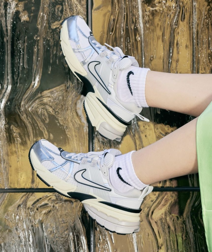 オシャレさん達の足元に光っているのが、ナイキのV2Kラン。最先端のデザインの中にどこかレトロな雰囲気も共存していて、まさに今を表現するスニーカーと言えそう。シルバーのライン使いがとっても繊細で、女性の足元にぴったりな一足です。