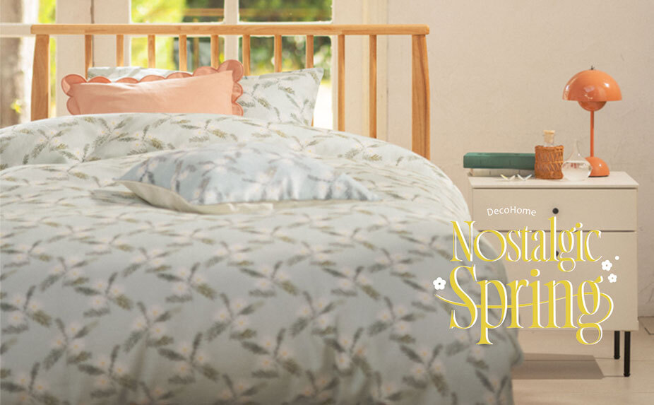 朝の光が爽やかに差し込むベッドルームには、レトロなデザインとさわやかなタンポポ柄のカバーリングアイテムがおすすめです。ホワイトを基調とした上品なコスメキャリー&ポーチも使うたびに気分が上がります。