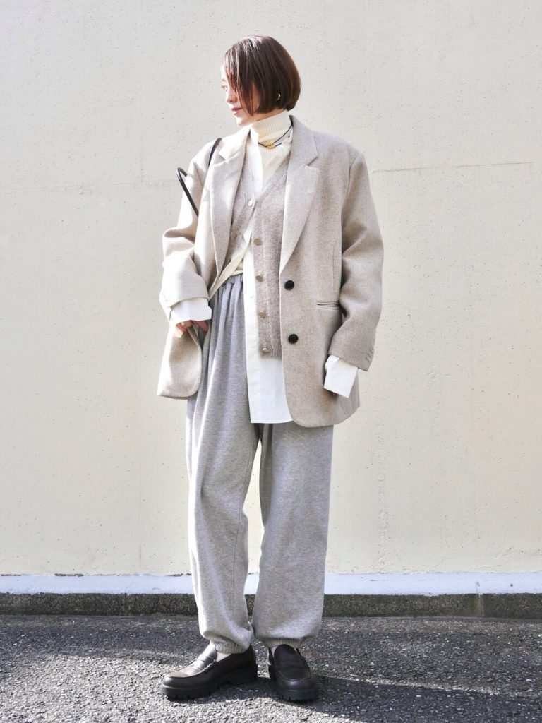 ゆとりのあるシルエットと裾を絞った、よくあるデザインのグレースウェットパンツは、淡色でまとめると40代が素敵に見える上品スタイルになります。ウール混のテーラードジャケットで、秋冬らしいあたたかみときちんと感をON。