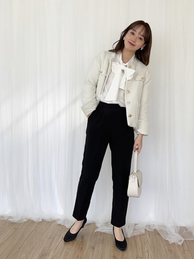 同じツイードライク素材のタイトスカートもあるので、セットアップで着こなすとスマートで様になります。ボウタイブラウスで華やかさもアップ。バッグやシューズなど小物もホワイト系でそろえて統一感のある着こなしに。