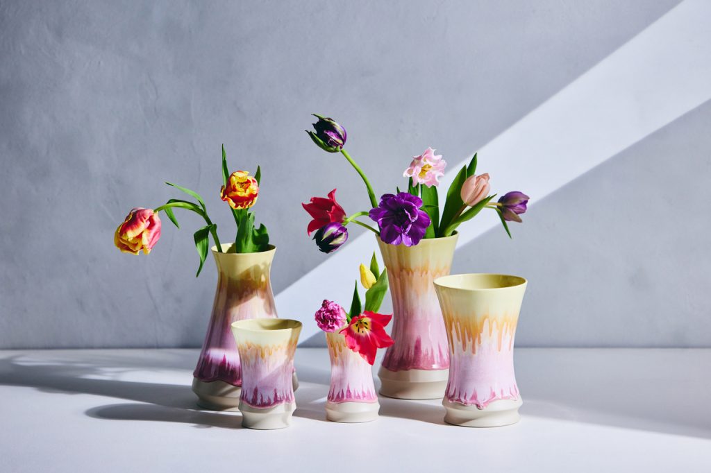 見ているだけで元気が出る、チューリップのようなフラワーベースがご所望ならばこれがイチオシ。イエロー、オレンジ、ピンク、ピーチのグラデーションを基調に、パッピーな配色に調えられています。