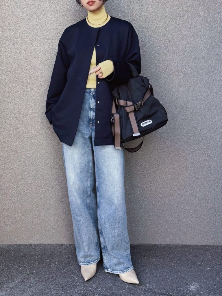 大人のカジュアルスタイルに欠かせないワイドデニムは、気になるお腹まわりをすっきり見せる股上高めのデザインがおすすめ。色落ちしたようなユーズド感のある加工は合わせるだけでトレンドの着こなしを叶えます。きれいめアウターやポインテッドトゥシューズでバランス調整をすると、ストリート感も主張されずクリーンにまとまりますよ。