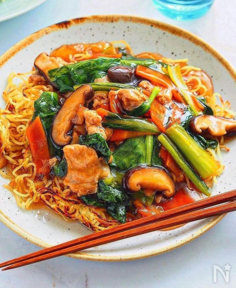 豚切り落とし肉と余りがちな野菜でおいしく作れるあんかけ焼きそば。具材を煮ている横で、かた焼き麺を同時に作ります。醤油ベースのあんがおいしいと人気のレシピで、野菜の種類は残りものでアレンジ可能です。