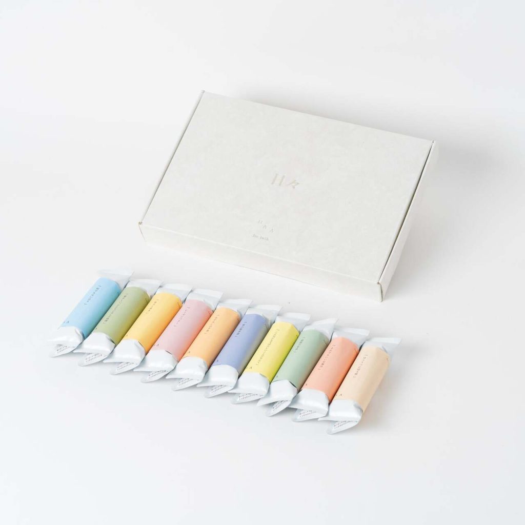 日本の伝統色を取り入れたおしゃれなパッケージで、使う前から心ときめく入浴剤。包み紙には心温まる文章が書かれていて、温かなお湯だけでなく言葉にも癒されます。