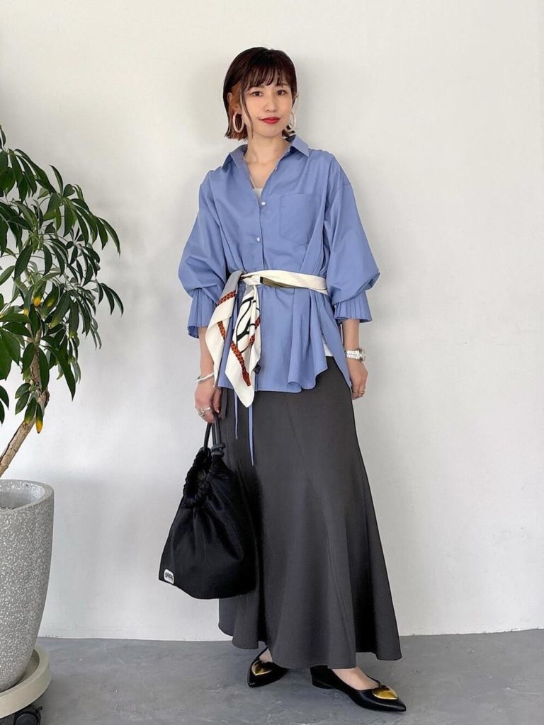 プリーツスリーブシャツ×ロングスカートで、動くたびに表情が変わる上品スタイル。柔らかなブルー×グレーの組み合わせに、優しげなカラーのスカーフを腰巻きすることで、大人顔でクラシカルな印象を演出できます。お出かけの足取りも軽くなりそうな、春にぴったりの着こなしです。