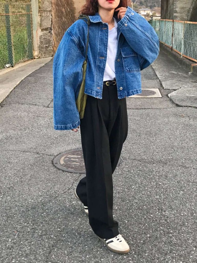 オーバーサイズのショート丈デニムジャケットが主役の、大人カジュアルコーデ。インナーは白Tで抜け感を出し、黒のワイドパンツでシックにまとめることで、バランスの取れたスタイルに。足元はクラシックなスニーカーで程よくカジュアルダウンし、こなれ感を演出。トレンド感がありつつも、シンプルで洗練された着こなしが魅力です。