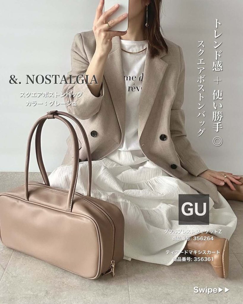 リラクシー感満点なワッフル素材のワンピースは、ジャケットを羽織って脱部屋着を。無地のシンプルなワンピースだからこそきれいめな印象も強く、ジャケットの金ボタンがスタイリングのアクセントに◎。黒のバッグが辛口エッセンスとなり、コーデ全体を引き締めてくれます。