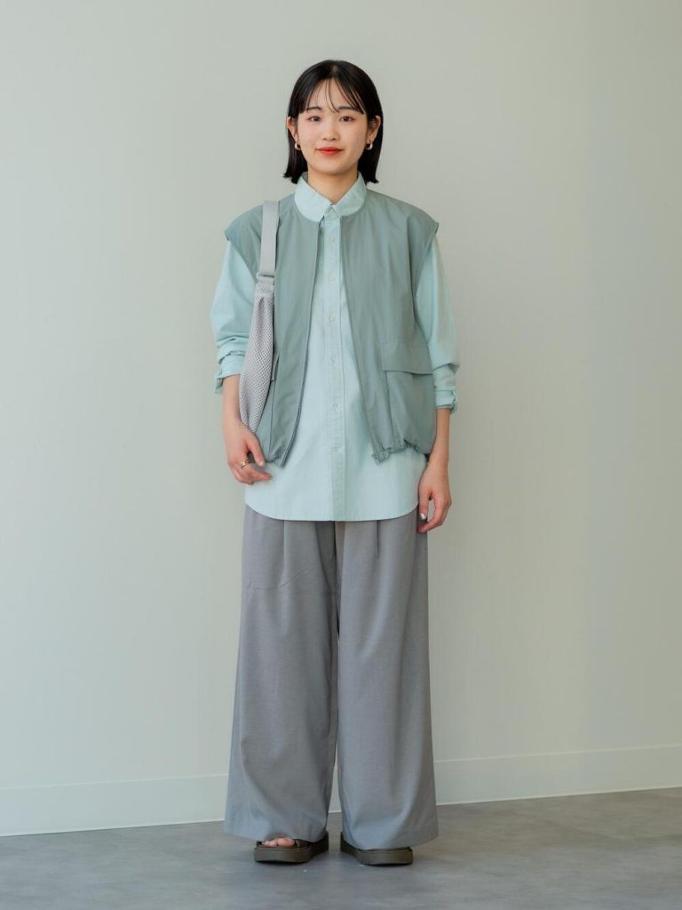 ライトグリーンは春めくカラー。同じグリーンのベストを重ね着してグレーのワイドパンツを合わせれば、寒色系の淡色で爽やかなきれいめリラクシーコーデに。