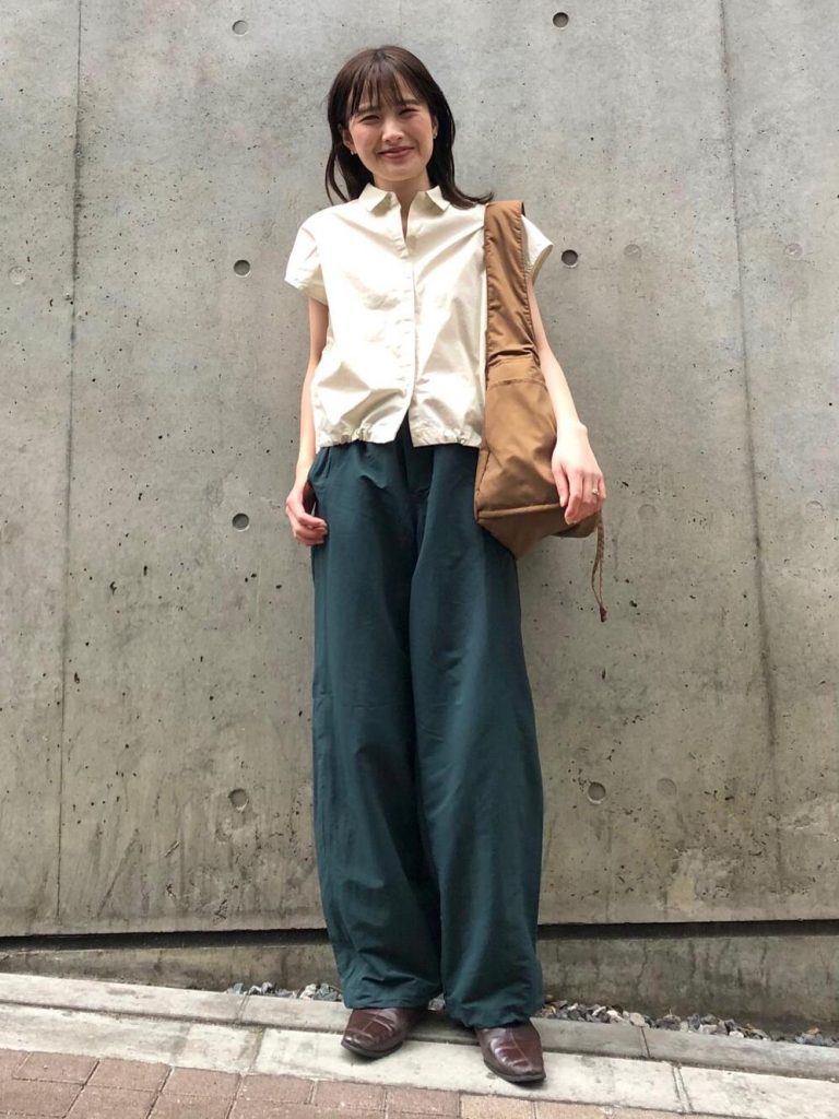 コットンとリネンをミックスさせたシャツは、滑らかな風合いが魅力。ギアパンツとのコーディネートならウエストアウトで、ナチュラルなスタイリングが叶います。スニーカーはもちろん、メリージェーンのようなフェミニンな足元でアクセントを付けるのもアリですね。