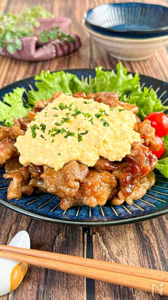 にんにくの風味が食欲をそそる豚こま肉の生姜焼き。玉ねぎはくし切りにし、豚肉には片栗粉をまぶしてから焼きます。甘辛いたれをまとった柔らかジューシーな豚肉と甘い玉ねぎが、おいしく溶け合って絶品ですよ。