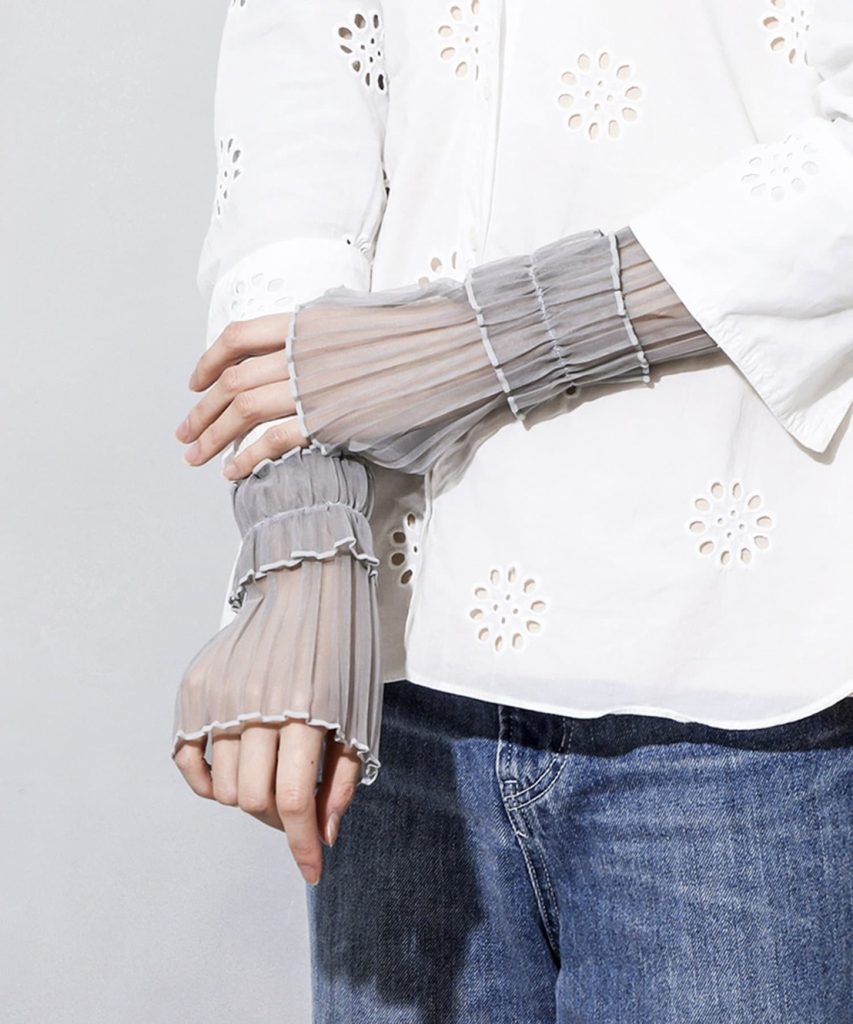 紫外線対策はしたいけど、見た目も可愛くいたいですよね。そんな方におすすめしたいのが「UVシアメローアームカバー」。透け感レースとメローデザインで、いつものコーデにプラスするだけで、グッと女性らしい印象に。