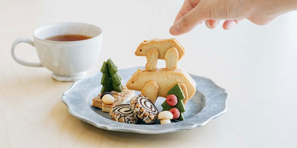 こちらのクッキー缶のいちばんのこだわりは、クッキーを立てて並べることで「小さな森」をつくれるようにしたところです。見た目のかわいさやおいしさはもちろんですが、クッキーを食べるだけでなく“楽しむ”こともできるクッキー缶にしたいと思いました。また、8種類のクッキーはそれぞれ食感や味を変えているので、飽きずに楽しんでいただけると思います。素材にもこだわっていて、北海道産小麦や京都の宇治抹茶などを使い、すべて手作業で丁寧に焼き上げています。