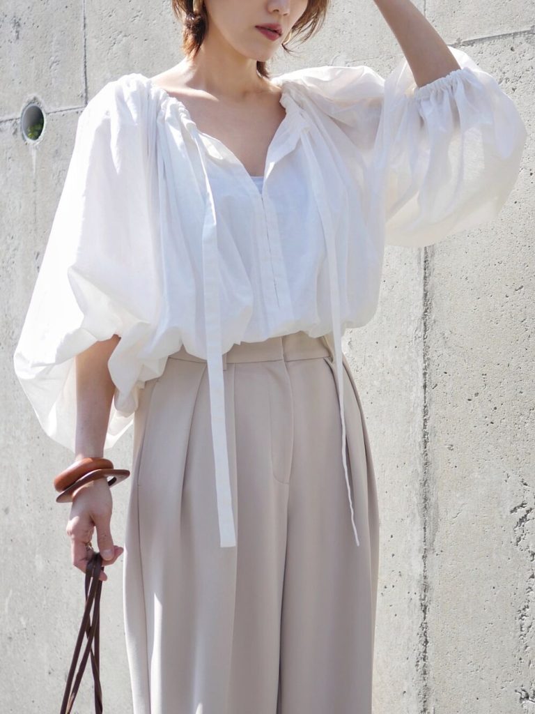 ①ボリューム袖で旬顔に!白×ベージュの柔らか配色