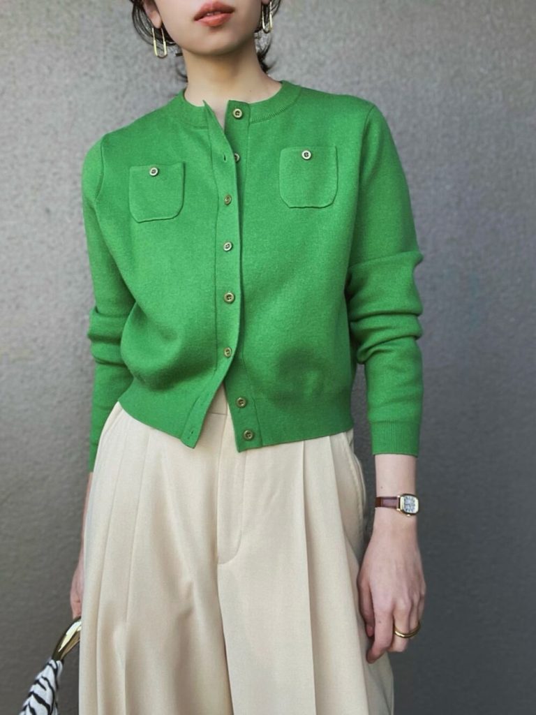 明るいグリーンのカーディガンが目を惹く、大人の春コーデ。ハリ感のあるベージュのワイドパンツを合わせて、華やかさと落ち着きを両立。ボタンを上まで留めた着こなしが上品さを演出しつつ、ゼブラ柄バッグで遊び心もひとさじ。シンプルなのに地味にならない、差し色を効かせた洗練スタイルです。