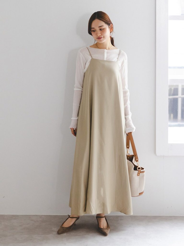 エアリーなベージュのキャミワンピに、ほんのり透け感のある白トップスを重ねた、清涼感あふれるコーディネート。シンプルながらも女性らしいラインが引き立ち、上品な可愛さが漂います。ブラウンの小物でコーデ全体に奥行きを出し、春のデートにもおすすめなフェミニンルックに。