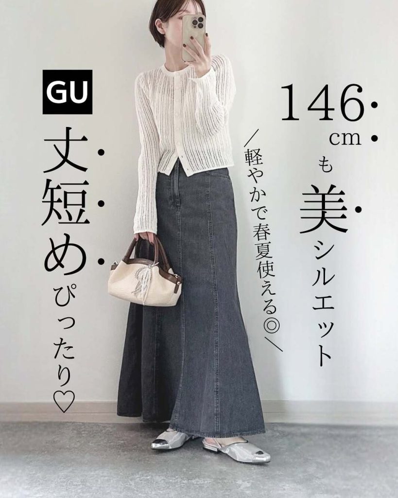 デニムは裾上げやお直しもできますが、デニムスカートとなると途端にハードルが上がります。そこでチェックしたいのがGUの丈短めタイプ。S・Mサイズでスカート丈は86cmなので、お直しいらず!裾に向かってきれいに広がるフレアシルエットを断つことなく楽しむことができます。