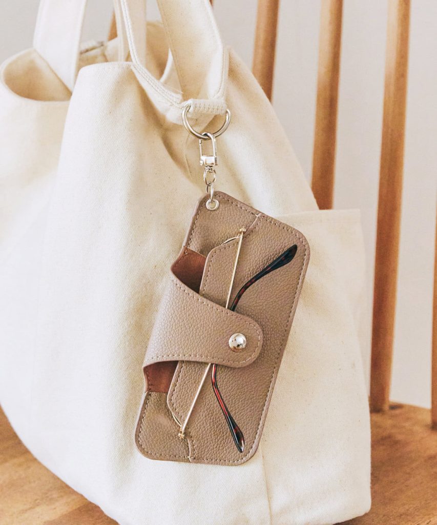 こちらはバッグのストラップに取り付けたスタイリング。サングラスやリーディンググラスなど、付け外しするメガネの一時保管にちょうどいいです。カラーはベージュとブラックがあります。