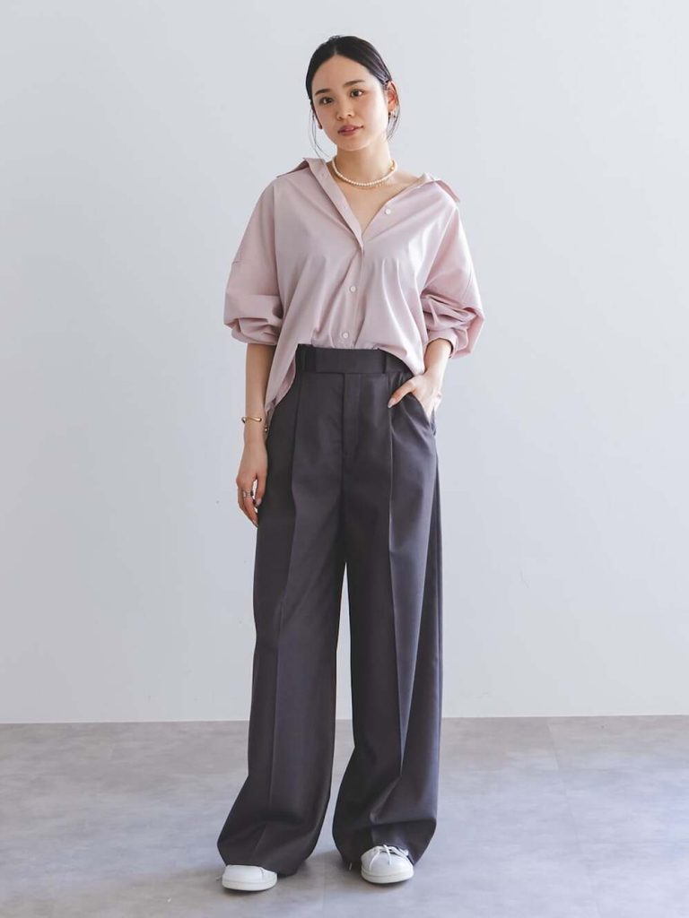 くすみ感のあるピンクシャツに、チャコールグレーのワイドパンツを合わせた洗練カジュアル。スニーカーでもきちんと感をキープできるのは、配色がシックだからこそ。さらにパールネックレスを添えれば、カジュアルになりすぎず大人の上品さがぐっと引き立ちます。ほどよく力の抜けたシルエットと絶妙な色合わせで、平日にも休日にも馴染む万能スタイルに。