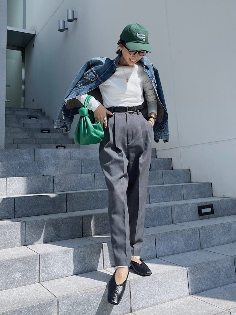 白トップス×グレースラックスの端正な組み合わせに、デニムジャケットとグリーンのキャップ&バッグで遊び心をプラス。カジュアルなアイテムながら、全体を縦長にまとめたバランスでスタイルアップも◎。足元はブラックのバレエシューズで抜けすぎを回避。配色とシルエットで魅せる、大人のこなれカジュアルです。