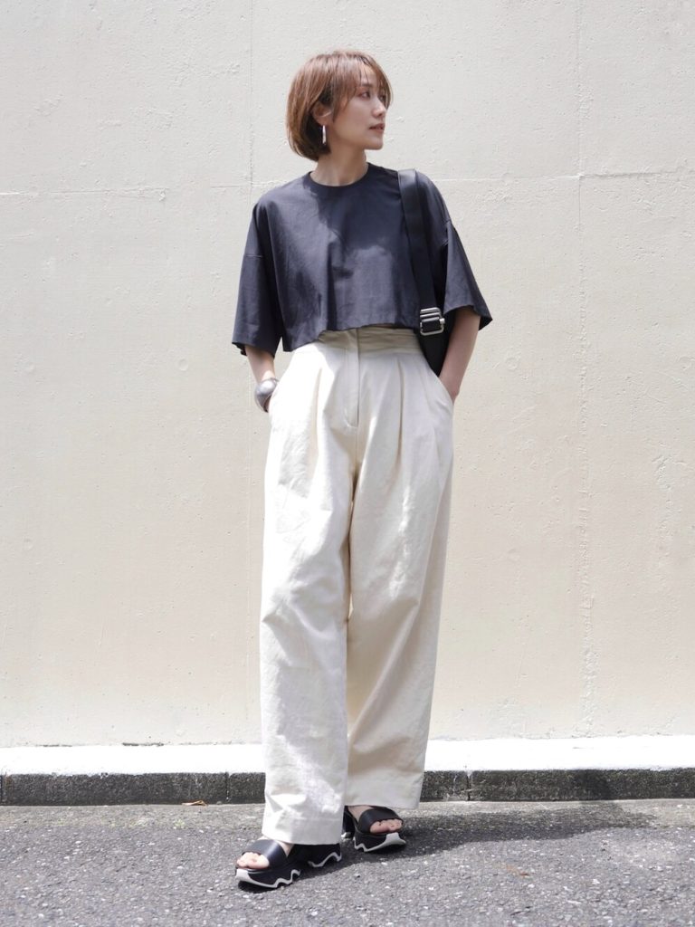 コンパクトな黒Tシャツに、ボリューム感のある白ワイドパンツを合わせたコントラストコーデ。全体をモノトーンでまとめることで、ラフな組み合わせも洗練された印象に。足元はソールに遊び心のあるスポーツサンダルで“今っぽさ”をON。メタルアクセや太めのショルダーバッグが、カジュアルすぎない大人の余裕を演出します。