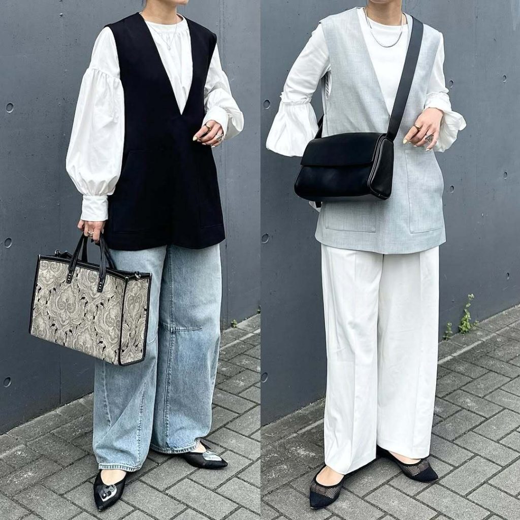 お腹の辺りまでシャープな切り込みが入ったVネックのベストは、春コーデで活躍してくれるアイテムのひとつ。ベストを重ねるだけでコーデに奥行きが生まれて、脱無難スタイルに。ワントーンの差し色としてベストを使ったり、カジュアルコーデのアクセントとしてベストを入れるなど合わせ方次第で印象もガラっと変わります。