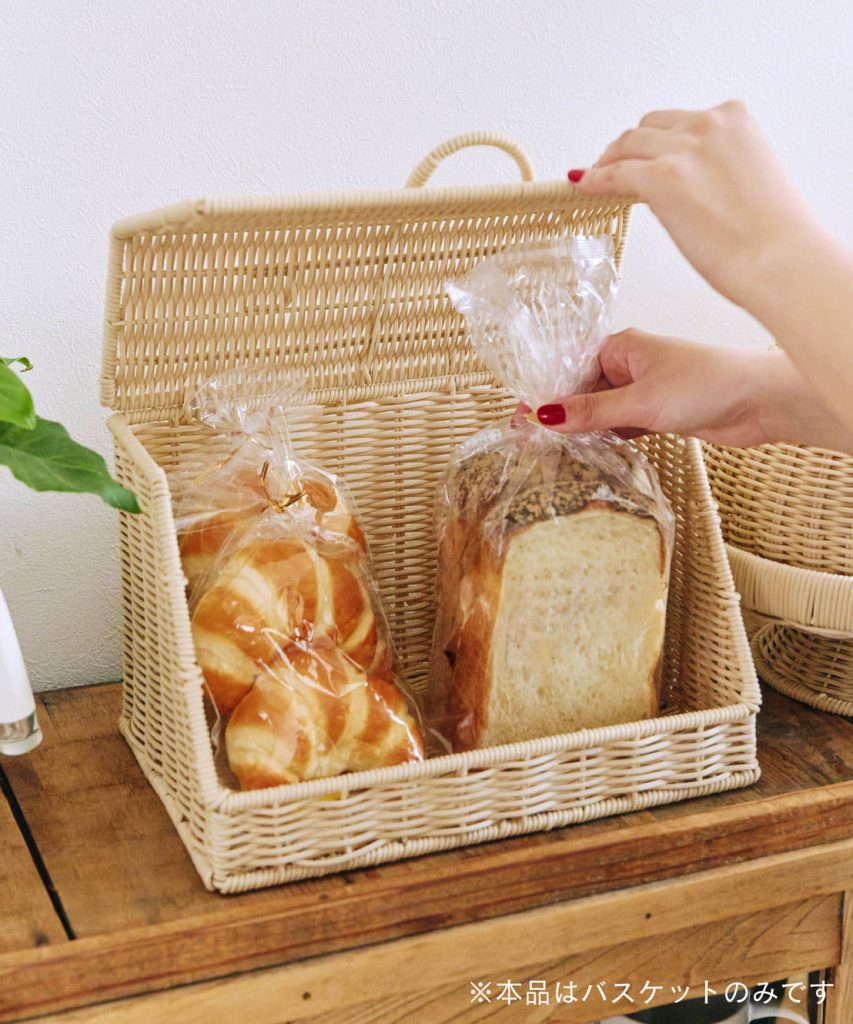 実は本物の木ではなく、PP=ポリプロピレンのラタンなので、汚れたら水で丸洗いできるのもうれしいポイント。食品を直接入れられるので、パンやサンドウィッチのメニューを入れて、食卓に出してもおしゃれです。