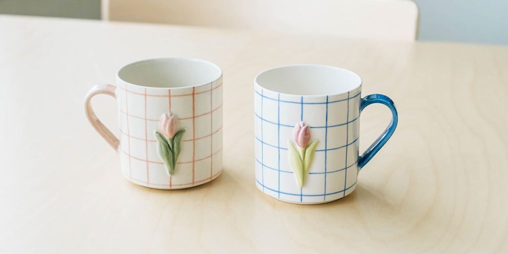 仲の良い同僚と色違いで購入。わたしが右のブルーを、同僚が左のピンクをセレクトしました。ぷっくりしたチューリップのレリーフと、それを引き立てるグラフチェック、そして個人的に大好きなブルーとピンクの組み合わせがたまりません。まるでアート作品のようで、こんなマグカップ初めて!と感激しました。しかも、レリーフが両面に付いているので、どの向きで置いてもかわいいんです。マグカップを裏返すと底にも小さなチューリップが描かれており、作家さんのこだわりと細やかな配慮が伝わってきます。