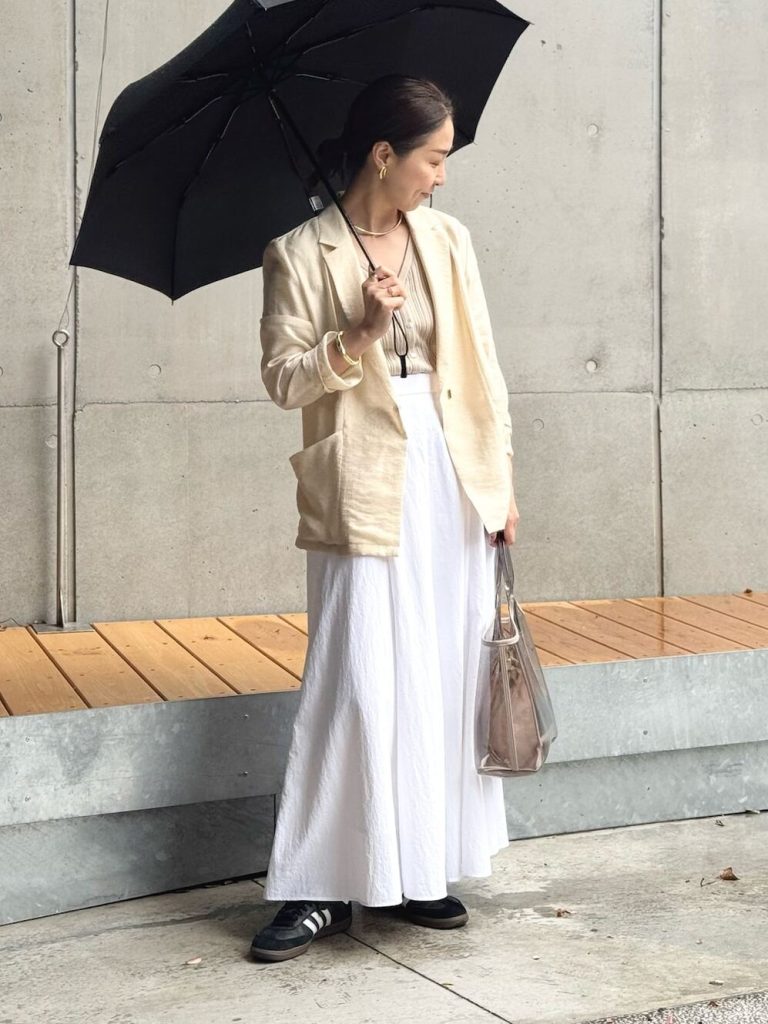 ベージュのシアージャケットとホワイトのフレアスカートを合わせた、軽やかで品のある雨の日コーデ。濡れても安心なPVCバッグで遊び心をプラスし、足元はきれいめスニーカーでスマートに仕上げ。アイテムのナチュラルな雰囲気がスタイルに表情を宿し、夏気分を高めてくれます。