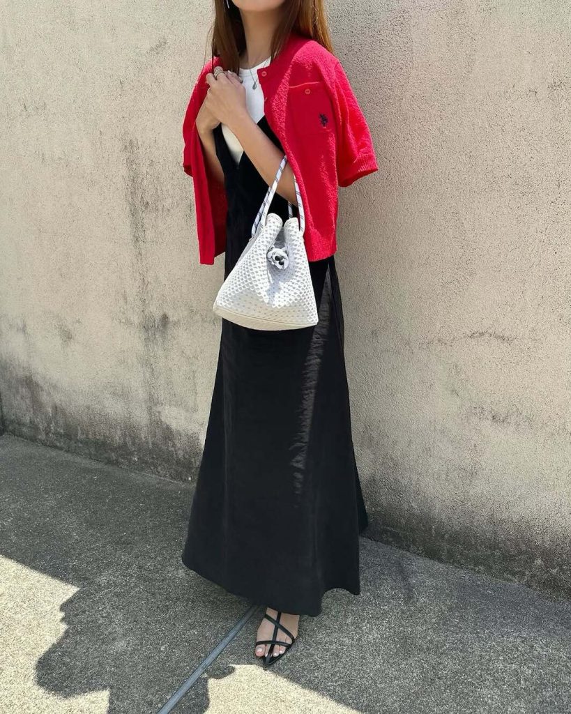 こちらも2025春夏注目のピンクをカーデで取り入れたポップな先取りスタイル。白をベースとした着こなしのため、ピンクだけが浮くことなくスムーズに馴染んでくれます。黒小物で引き締めポイントを作れば、ピンクとの対比も効果的に。