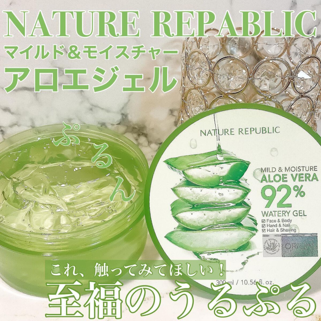 水分補給しながら、保湿&鎮静ケアを叶える、NATURE REPUBLIC(ネイチャーリパブリック)のジェル。保湿と鎮静に優れたアロエベラを92%配合し、敏感な肌を落ち着かせます。