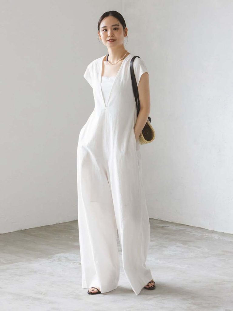 真っ白なオールインワンは、夏の光に映えるクリーンな一枚。深めのVネックとノースリーブデザインがデコルテや腕をすっきり見せ、顔まわりに軽やかな抜け感をプラス。ストレートなワイドシルエットが脚のラインを拾わず、スタイルアップにも効果的です。かごバッグと華奢なサンダルを合わせれば、上品さとリラックス感を兼ね備えた大人の初夏コーデが完成。アクセサリーで女性らしさをほんのり添えて。