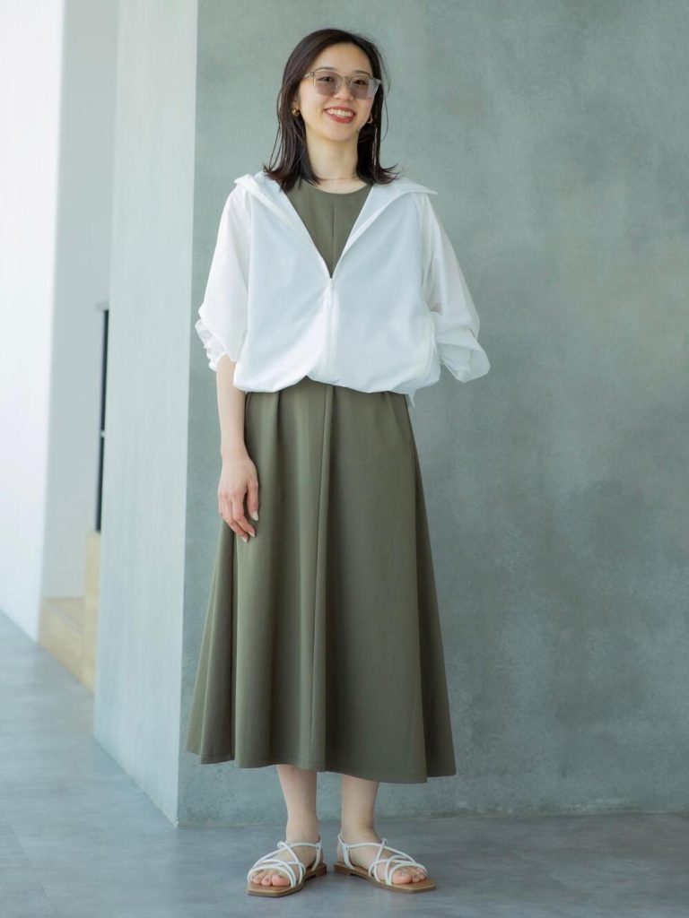 羽織るだけでUVカットを叶えるパーカは、コンパクトで持ち運びやすく、小雨程度ならはじく撥水加工など機能性がバツグンです。オフホワイトは明るいカラーで表情まで明るく見せます。